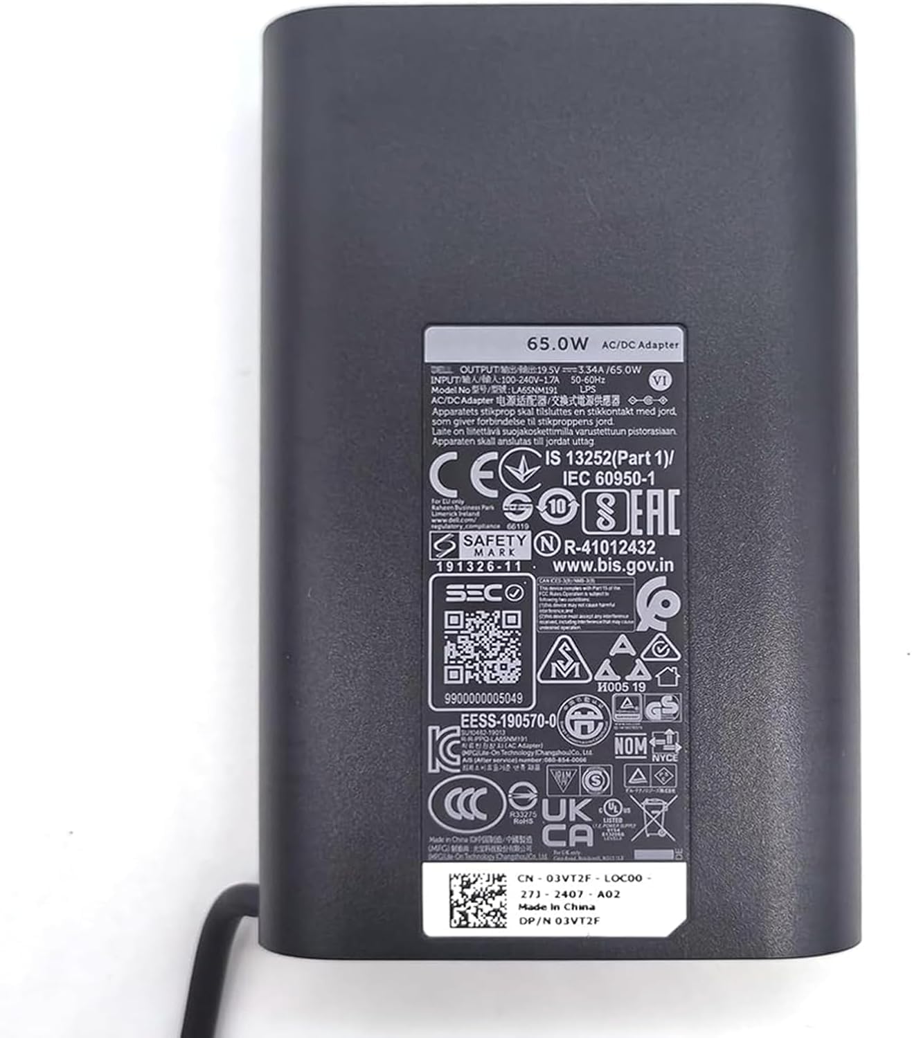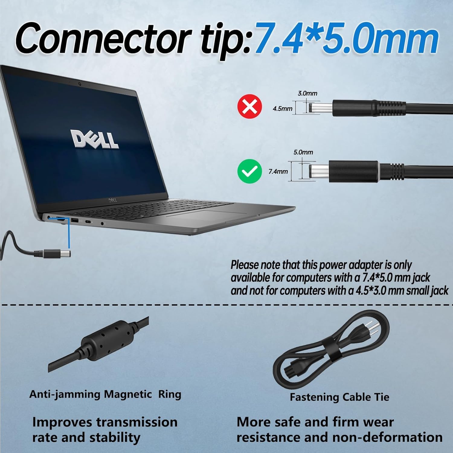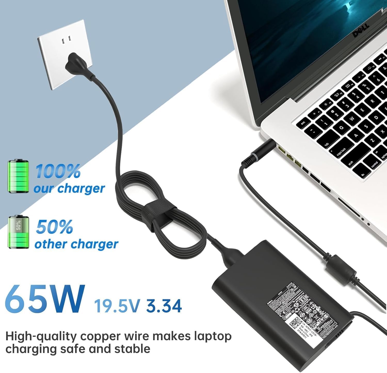 Output: 19.5V 3.34A ~ 65W; Input: 100-240V ~ 1.5A, 50 – 60Hz. Connector Tip: 7.4mm*5.0mm,supports fast charging