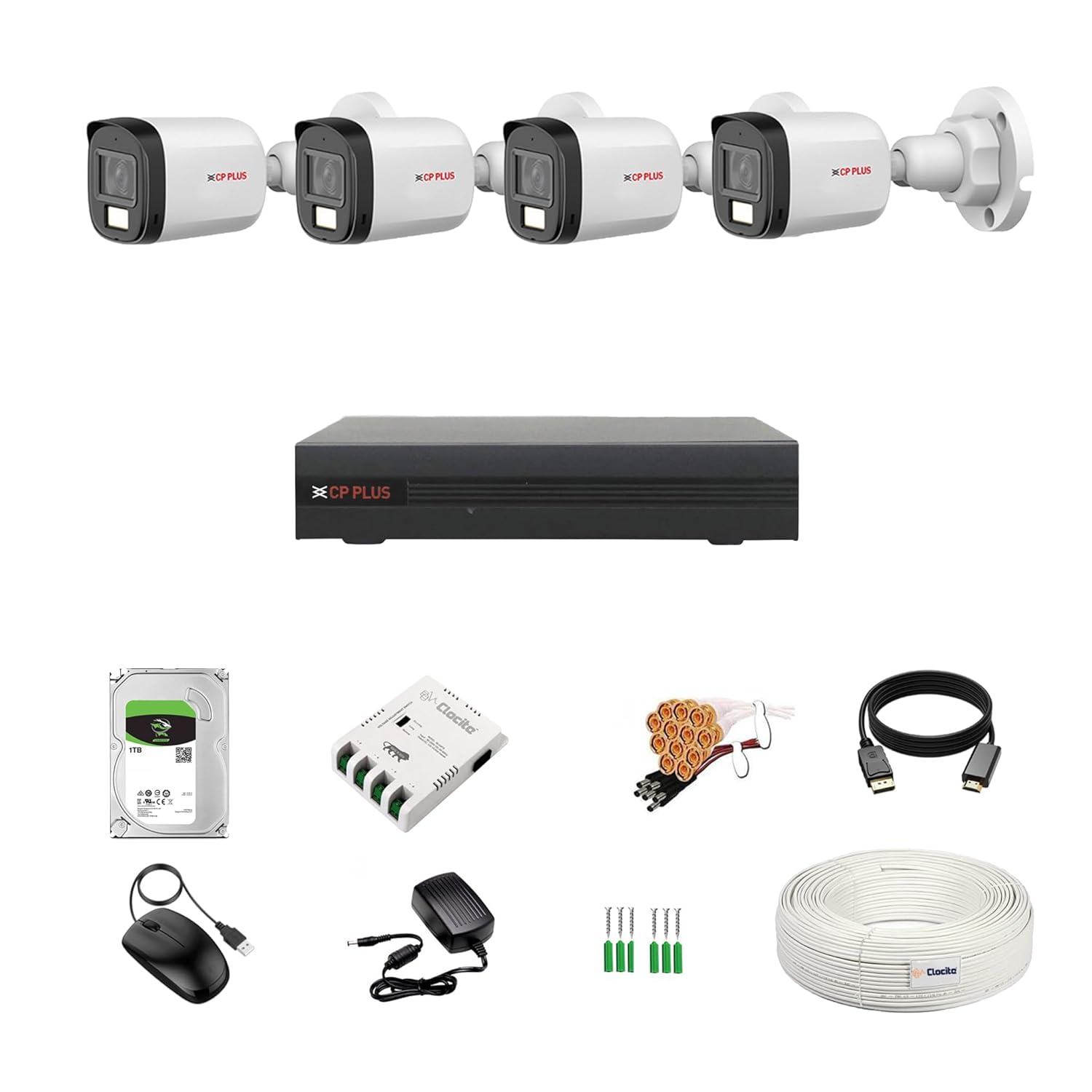 Included Components: CP PLUS 2.4MP Dual Light Bullet Camera 4 Nos, 2.4MP 4CH DVR 1 Nos (Including Mouse & Adapter), 1TB Hard Disk 1 Nos, Clocite CCTV Coaxial Cable 1 Roll, Clocite 4Ch SMPS With Power Card 1 Nos, Screw Hole Covers Stickers & Screws For All Cameras, BNC 8 Nos, DC Connectors 4 Nos, and HDMI Cable 1 Nos.